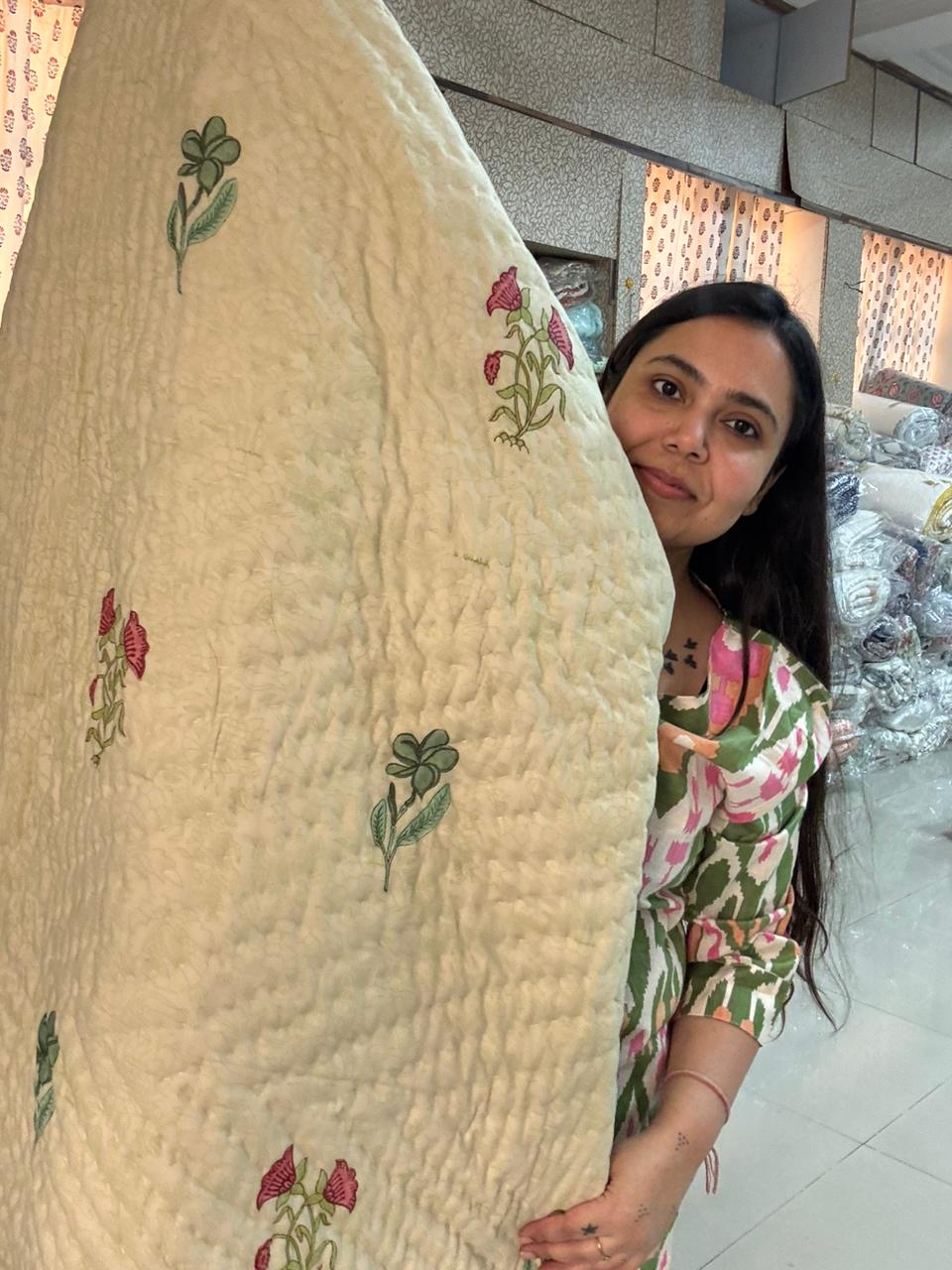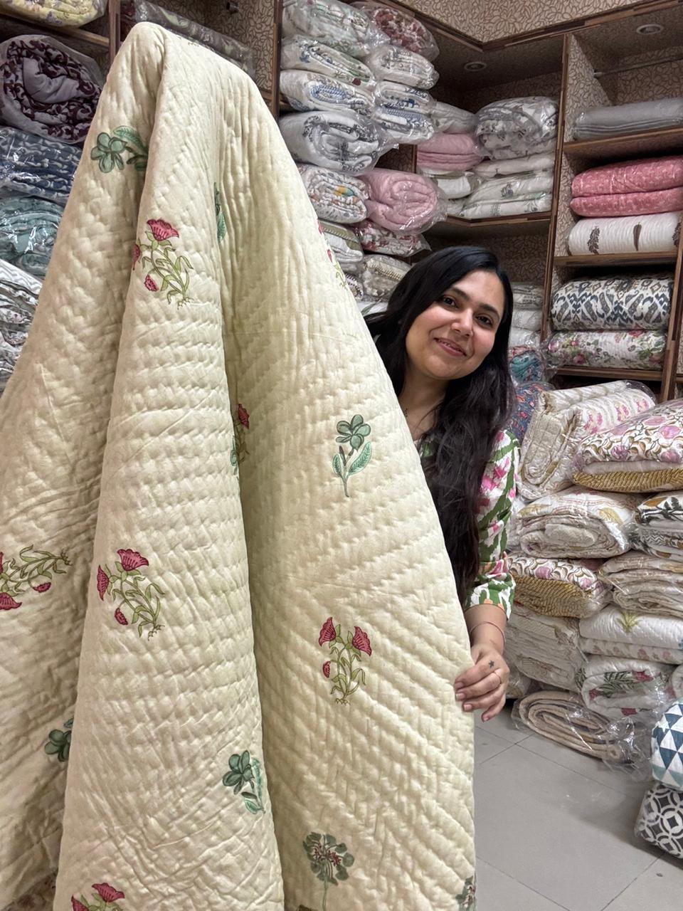 Hand Stitched Block Print Jaipuri Quilt. Each piece is done for your comfort, soft color palette. Soft, muted colors like pastels and neutrals create a calming atmosphere.