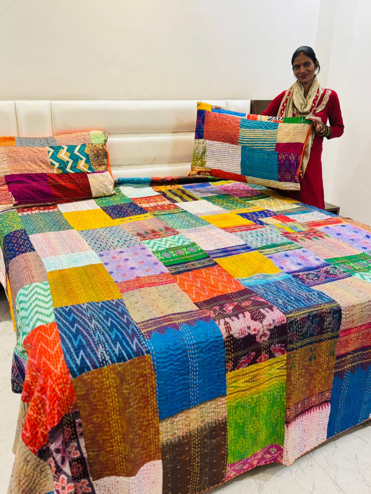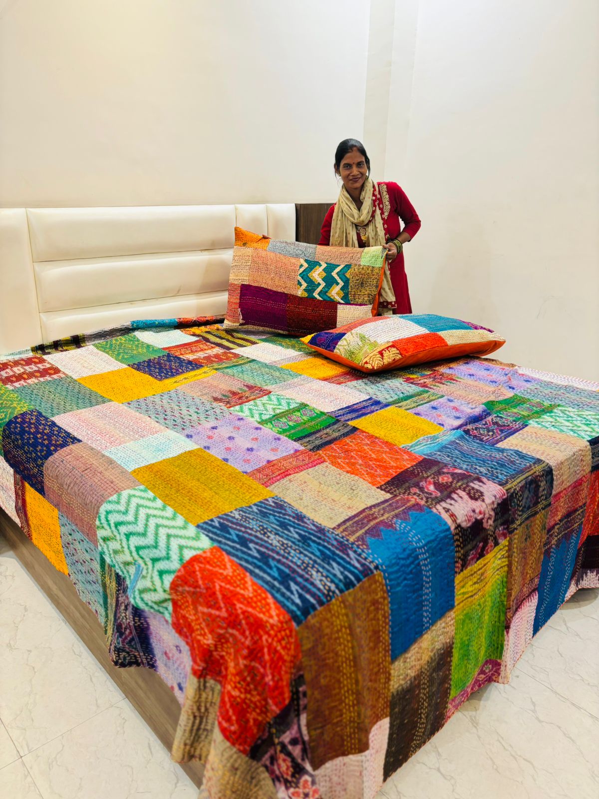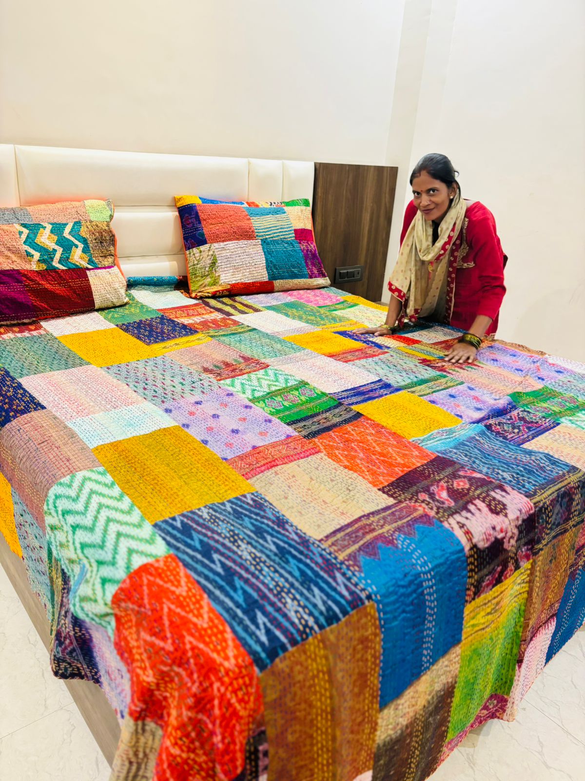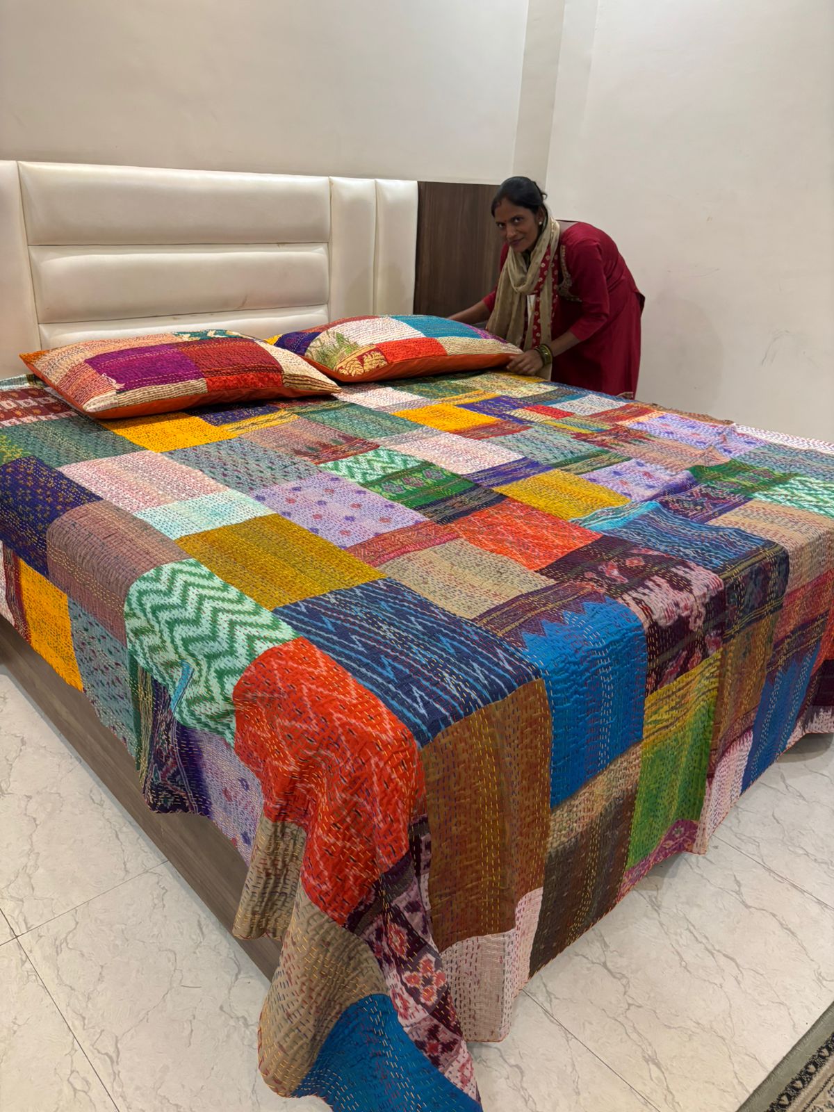 Designed to generously cover most beds, our King Size Kantha Bedcover measures a substantial 90 x 108 inches. This size provides excellent coverage for a king or queen mattress, instantly becoming the focal point of your bedroom decor.