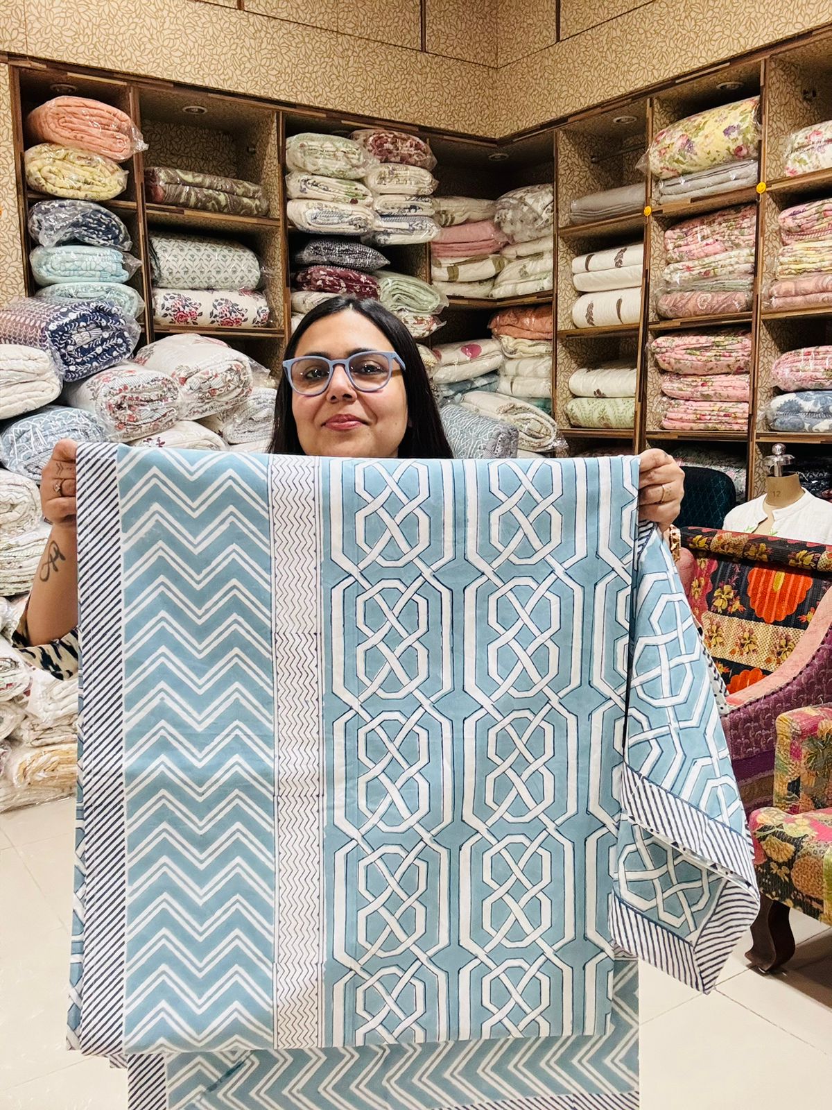 Grey Dusky Blue Heaven - Cotton Handblock Printed Fitted Bedsheets/ Customised Fitted Sheets (Dispatch time 24 hours)