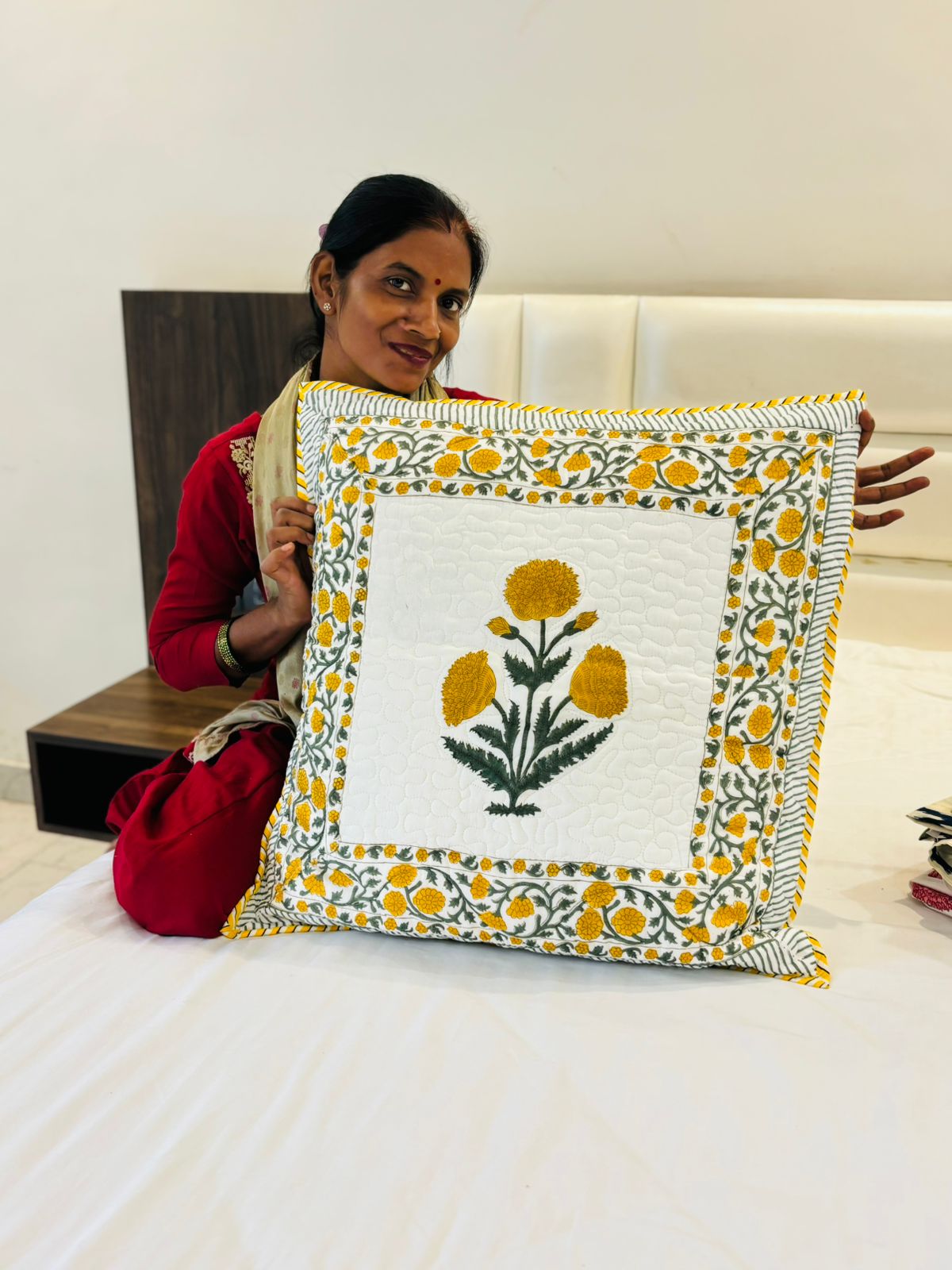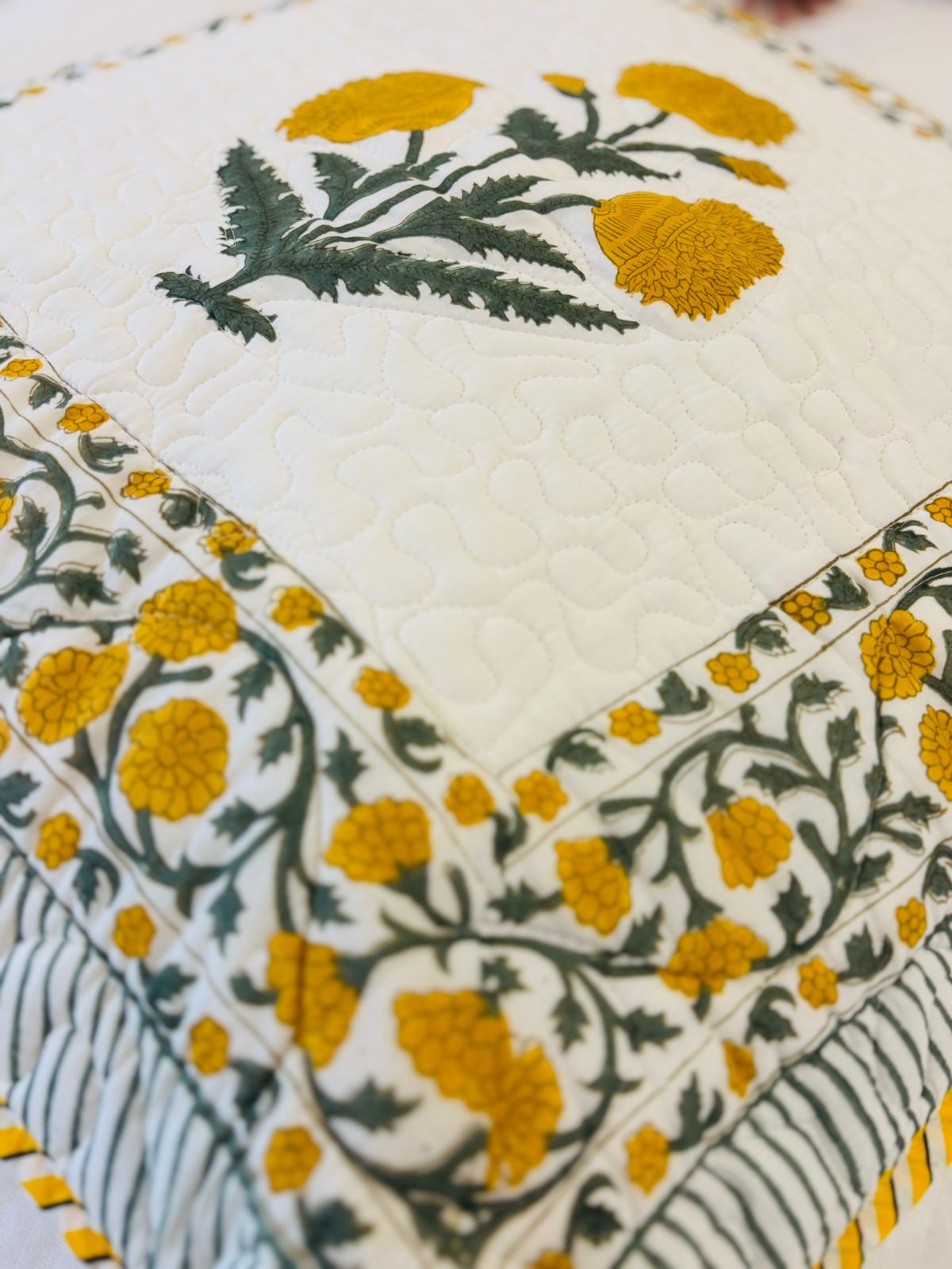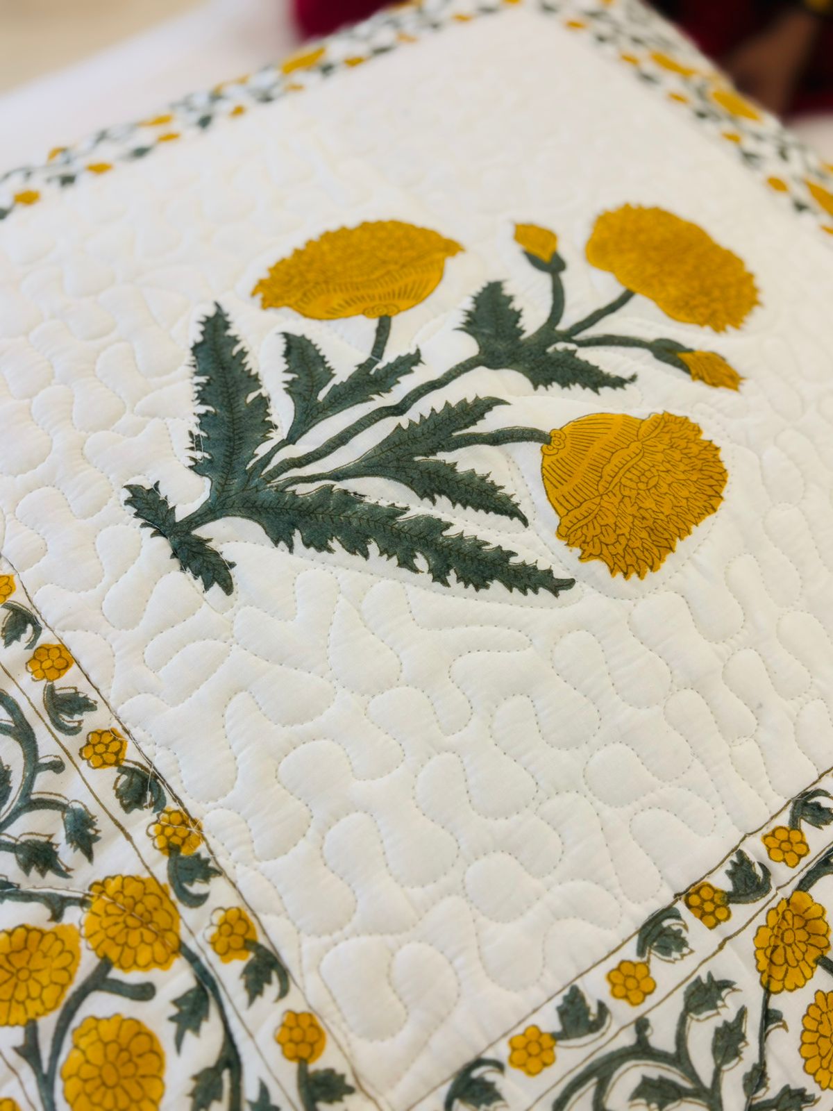 Quilted Block Print - Cushion Cover - Yellow Poppies (Pair - Set of 2 Quilted Cushion Covers) 24*24 inches (Dispatch Time 24 hours)