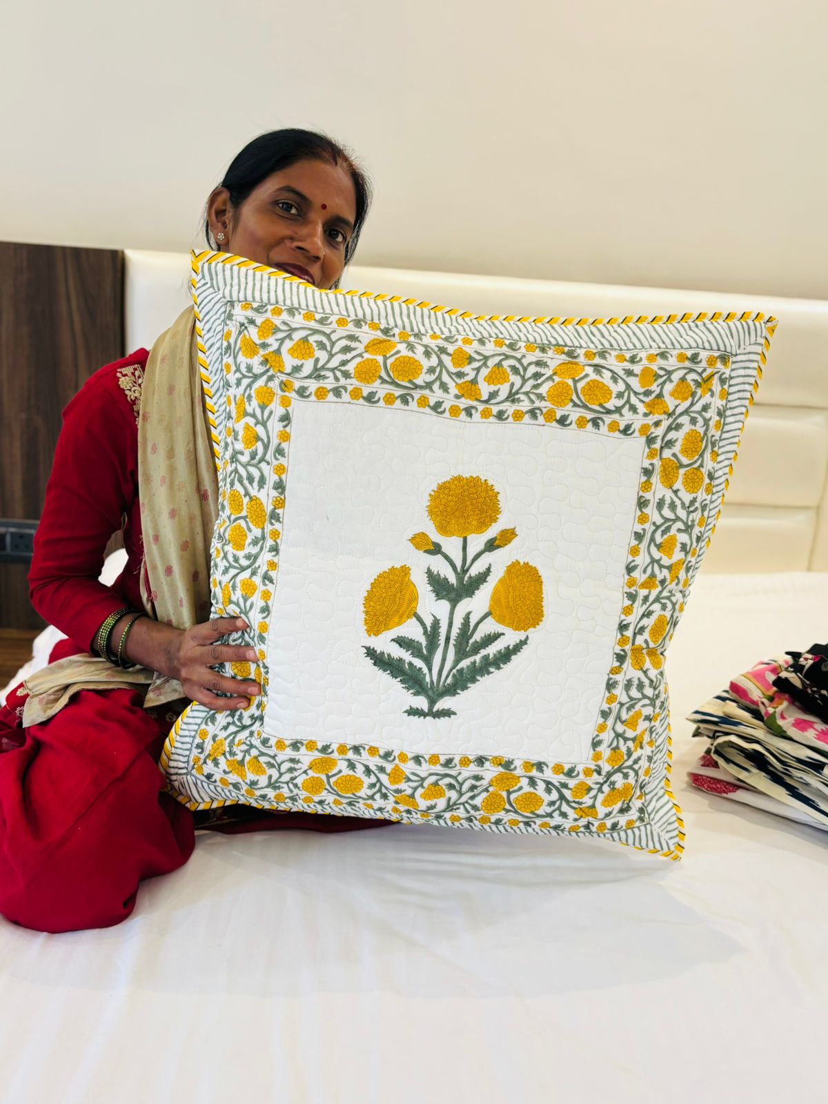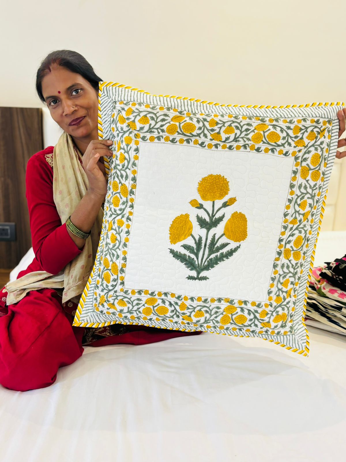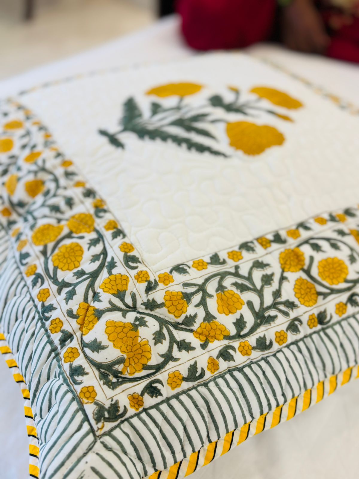 Quilted Block Print - Cushion Cover - Yellow Poppies (Pair - Set of 2 Quilted Cushion Covers) 24*24 inches (Dispatch Time 24 hours)