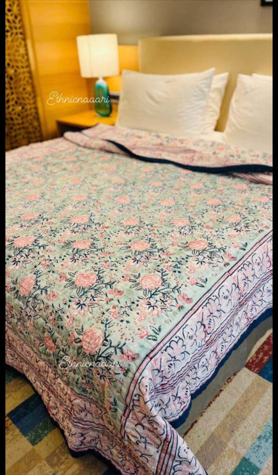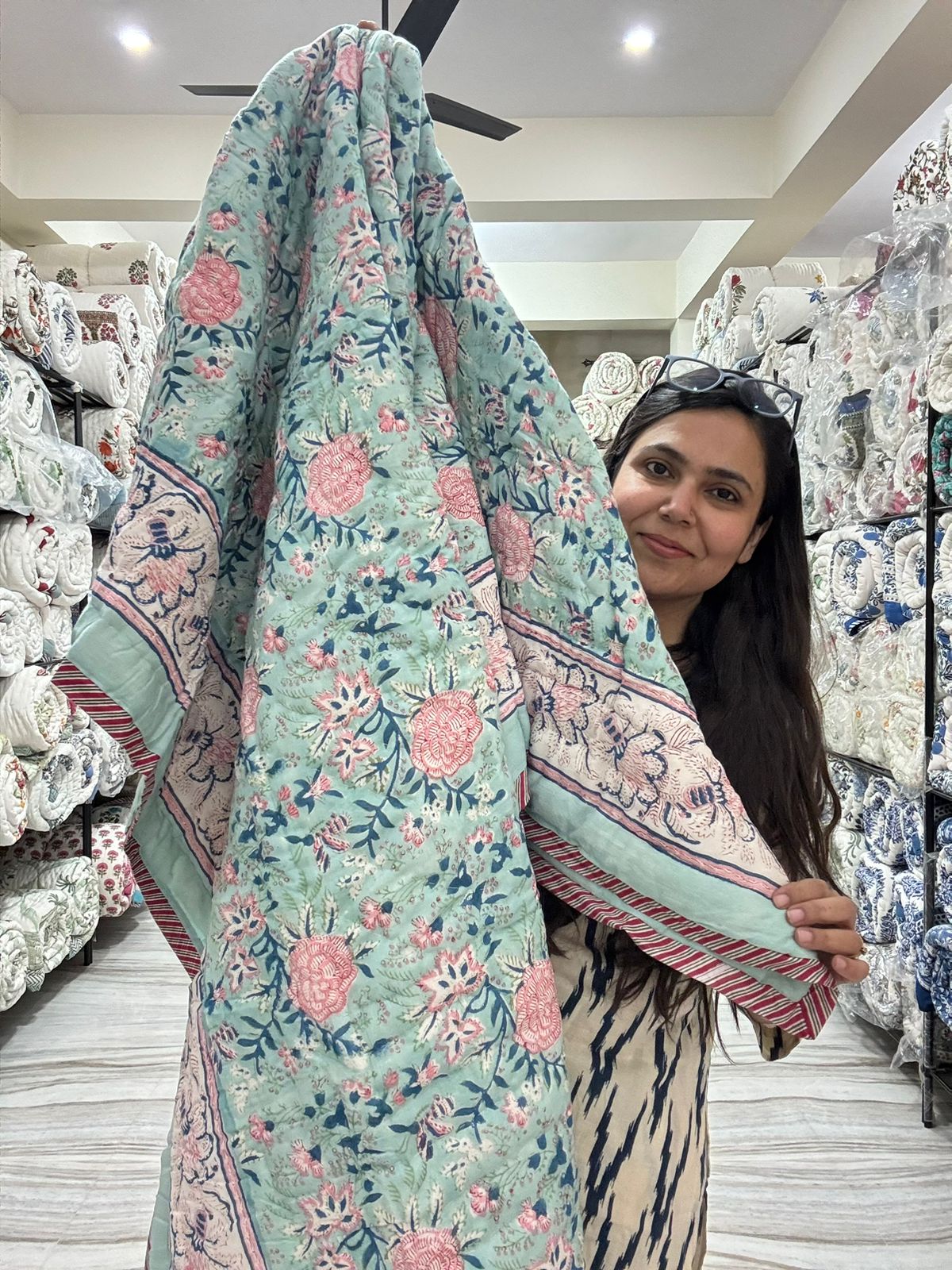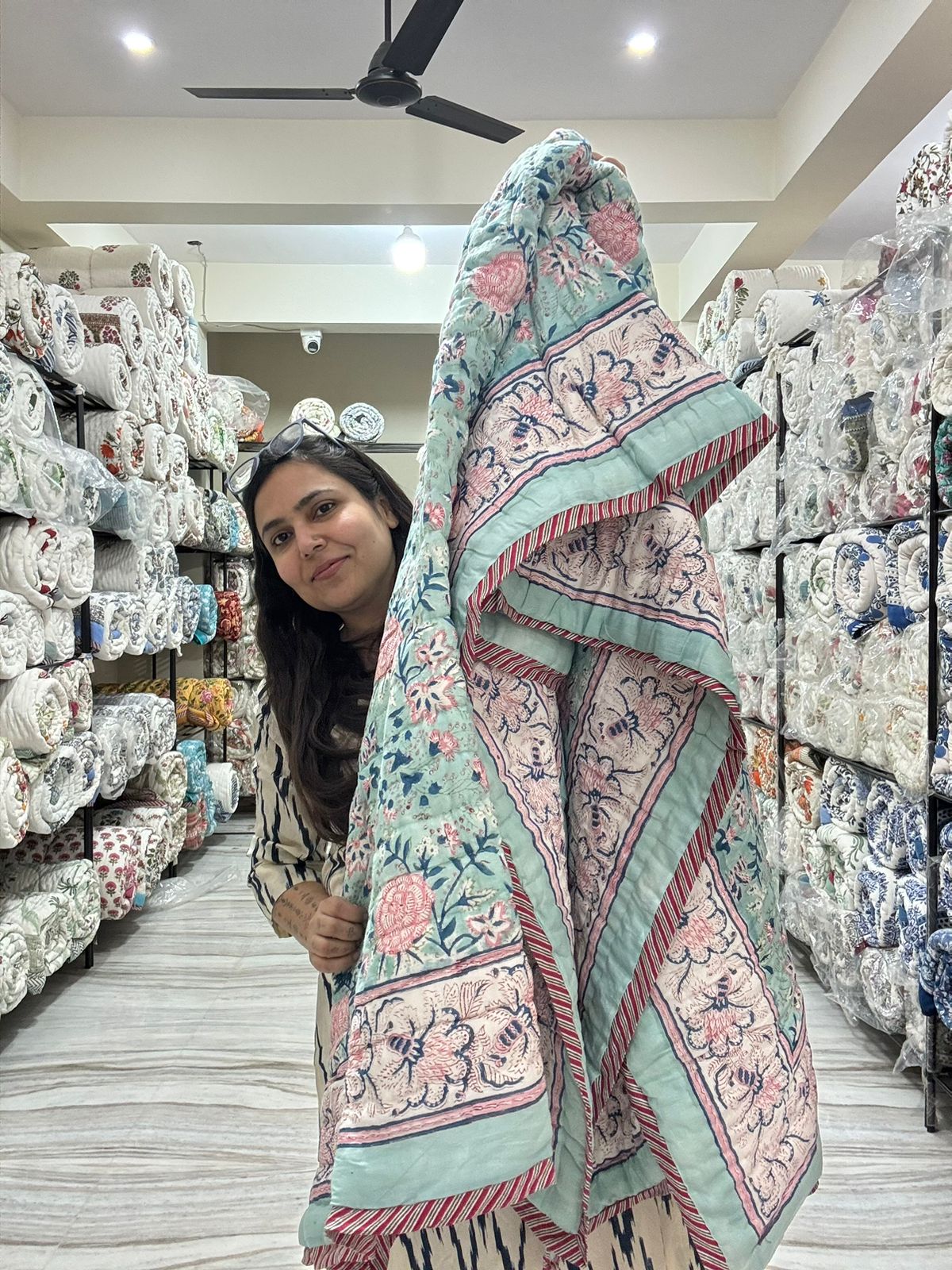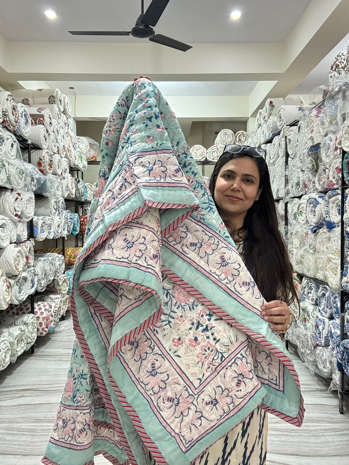 Hand Stitched Block Print Razai, Each piece is done for your comfort, soft color palette. Soft, muted colors like pastels and neutrals create a calming atmosphere.