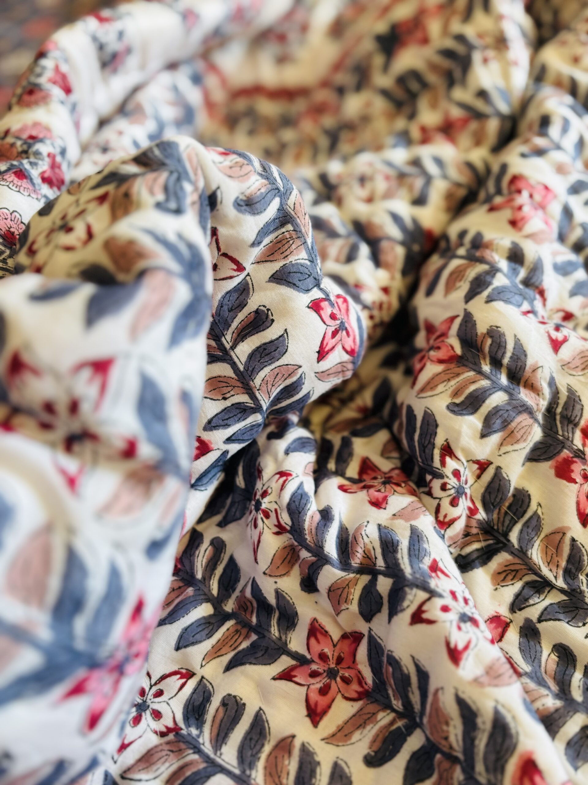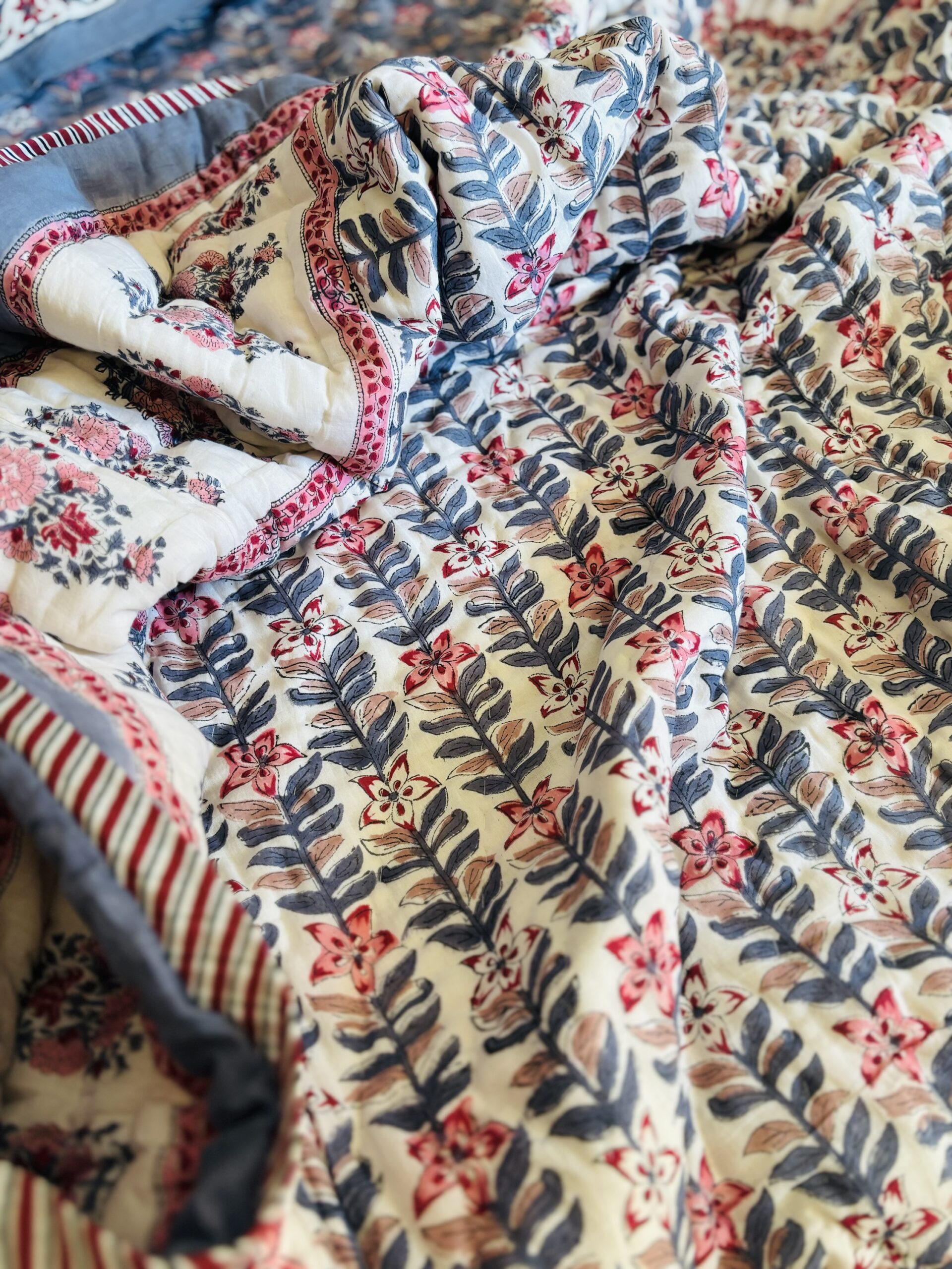 Hand Stitched Block Print Razai, Each piece is done for your comfort, soft color palette. Soft, muted colors like pastels and neutrals create a calming atmosphere.